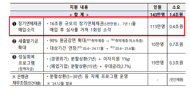 - 장기 연체 채권 소각에는 약 8천억 원이 필요하며, 이 중 절반(4천억 원)은 추경을 통해, 나머지는 금융기관이 부담합니다.