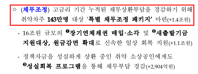 - 대상 채무: 코로나19 등으로 피해를 입은 소상공인·자영업자의 채무