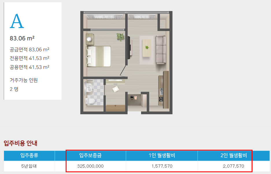 - 22평형: 보증금 2,000만원, 월 생활비 115만원