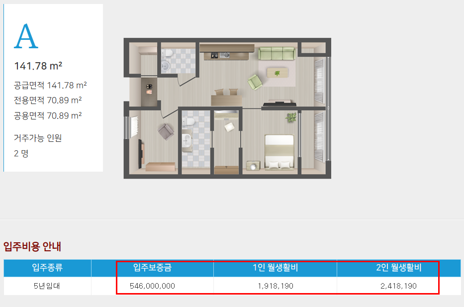 - 1인 2실 (42평): 보증금 2억원, 월 생활비 134만원