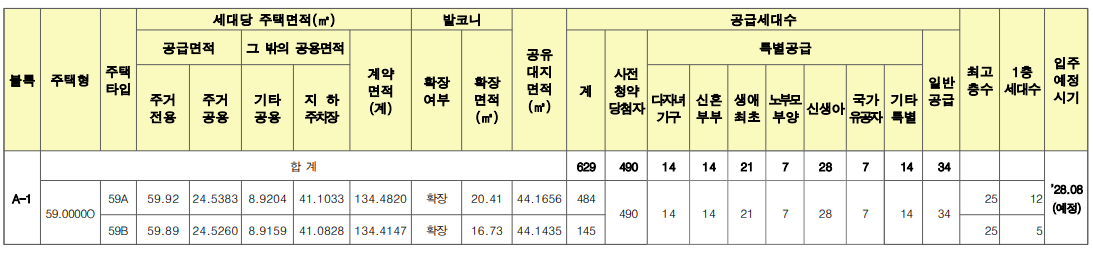 - 공급세대: 629세대(전용 59㎡, A타입 484세대, B타입 145세대)