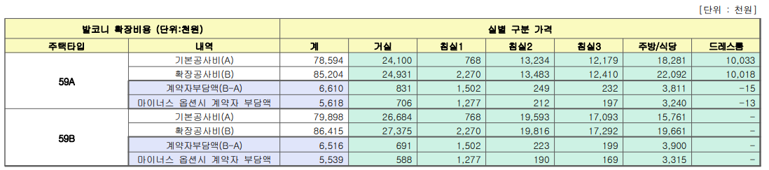 - 발코니 확장비: 661만원 내외, 마이너스옵션 선택 시 저렴