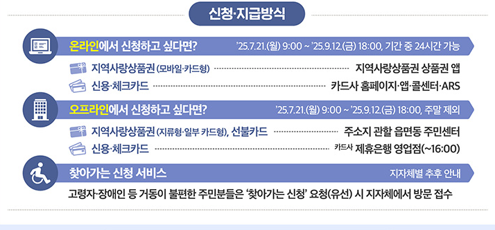 - 오프라인 신청: 신용/체크카드는 본인 명의 은행, 선불카드는 동주민센터 (대리 신청 가능).