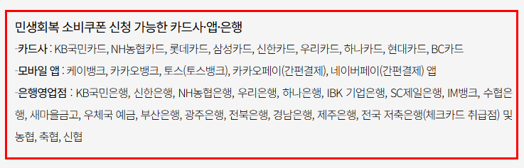 온라인 신청이 어려운 경우를 위해, 7월 21일부터 각 카드사와 연계된 은행 영업점(오전 9시부터 오후 4시까지)을 방문하여 직접 신청하는 방법도 마련되어 있습니다. KB국민카드, NH농협카드, 롯데카드, 삼성카드, 신한카드, 우리카드, 하나카드, 현대카드, BC카드 등 주요 카드사뿐만 아니라, 대부분의 시중은행과 상호금융기관에서도 신청이 가능하니, 본인이 주로 이용하는 금융기관을 확인해보시기 바랍니다.