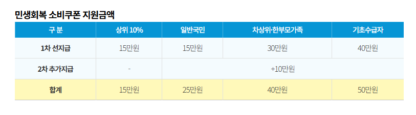 - 전 국민 지급: 일반 15만 원, 차상위/한부모 30만 원, 기초생활수급자 40만 원 (1차 기준).