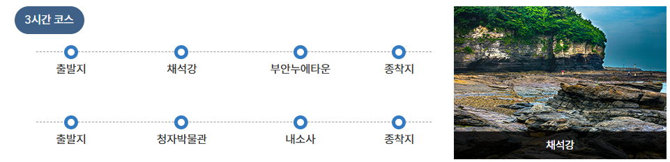 - 3시간 코스: 채석강 → 부안누에타운 / 청자박물관 → 내소사