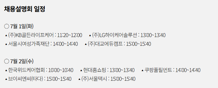 - 다양한 직무 기회: 아이돌보미, 요양보호사, 상담, 운전, 매장지원 등 중장년층에 적합한 다채로운 직무 채용.