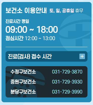 - 중원구, 수정구, 분당구 등 각 구 보건소에 전화 문의도 가능합니다.