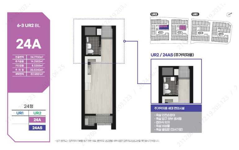 신청자는 일반공급분과 주거약자용(고령자, 장애인 등) 물량 중 각자의 조건에 맞는 유형을 선택할 수 있습니다. 각 주택형에는 전용면적과 주거약자 맞춤형(저층, 편의시설 등)이 구분되어 있으며, 일부 세대에는 빌트인 가구 및 가전이 제공됩니다.