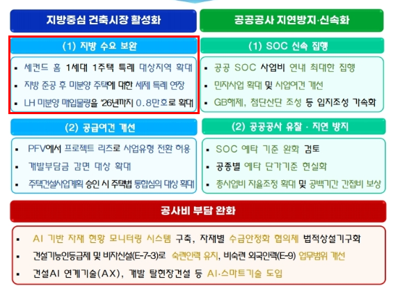 미분양 주택 취득 시 양도·종부세 1주택 특례, 주택 수 제외 특례 적용 기한도 기존 2025년에서 2026년까지 1년 연장되고, LH의 공공매입 물량 확대, 감정가 기준 상향 등 ‘지방 건설경기 살리기’ 노력이 진행 중입니다.