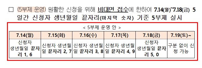 원활한 접수 신청을 위해서 신청 첫주에는 비대면 접수에 한해서 신청자의 생년월일 긑자리 숫자로 5부제를 실시합니다. 아래의 날짜별로 본인의 신청기간을 확인하시기 바랍니다. 첫번째주 신청기간이 지나면 누구나 원하는 날짜에 신청할 수 있습니다.