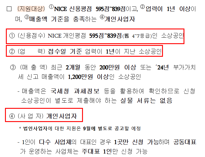 - 사업자 형태: 개인사업자(공동대표는 1인만 신청 가능, 법인은 2025년 9월 이후 별도 공고 예정)