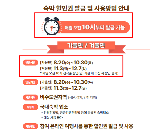 이는 지역 경제 회복은 물론, 봄·여름 피해를 입은 곳에 여행객을 유치해 빠른 활력을 불어넣는 효과가 기대됩니다. 서울, 경기, 인천을 제외한 비수도권 숙소에는 3만 원(7만 원 이상) 또는 2만 원(미만) 할인권이 적용됩니다.