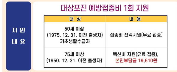 - 50세 이상 기초생활수급자: 접종비 전액 무료