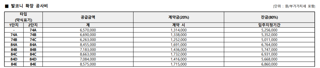 - 발코니 확장 공사비(타입별/단지별 상이) 별도