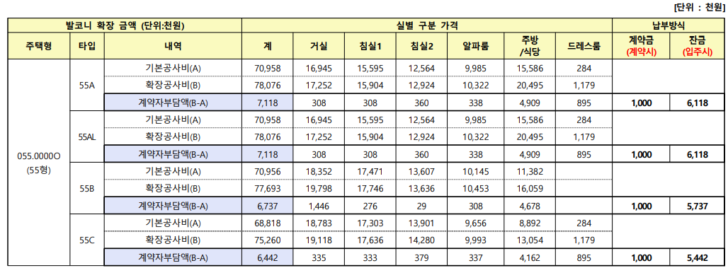 - 발코니 확장비·취득세·인지세 별도, 실입주금 확인 필요