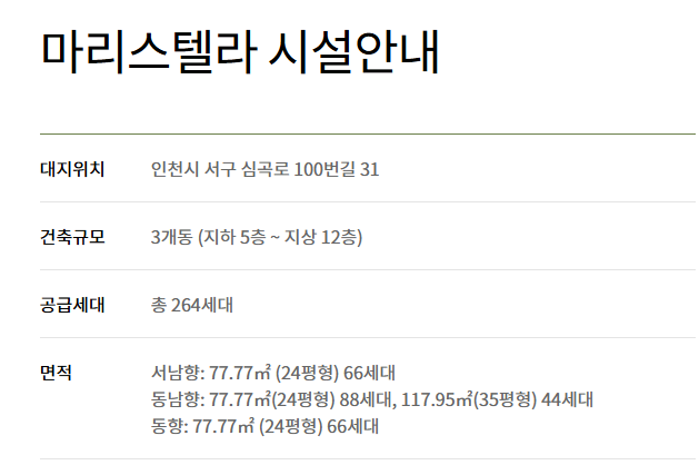 인천 서구 심곡로에 위치한 마리스텔라는 병원 연계형 도심 실버타운입니다. 보증금은 24평형 기준 2억5,000만원이며, 월 생활비는 1인 기준 172만원(의무식 45식, 청소서비스 포함), 90식으로 확대시 208만원에 이릅니다.