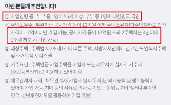 1주택자는 물론, 다주택자라도 합산 공시가격이 12억 원 이하라면 신청할 수 있습니다. 만약 2주택자가 12억 원을 초과할 경우, 3년 이내에 1주택을 처분한다는 조건으로 가입이 허용됩니다.