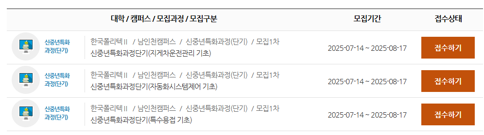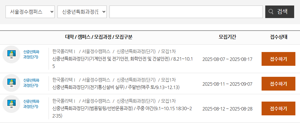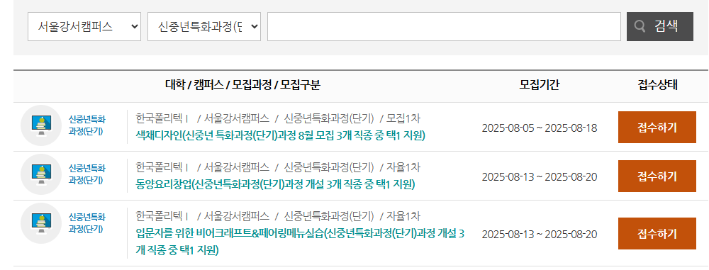 각 캠퍼스별로 현재 모집중인 신중년특화과정 커리큘럼과 원서접수 가능한 과정은 한국폴리텍대학 입시포털 홈페이지에서 확인하시기 바랍니다.