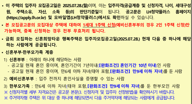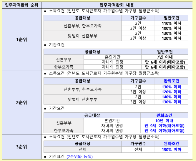 - 무주택신혼부부, 예비신혼부부, 한부모가족(완화된 자녀·소득 기준)