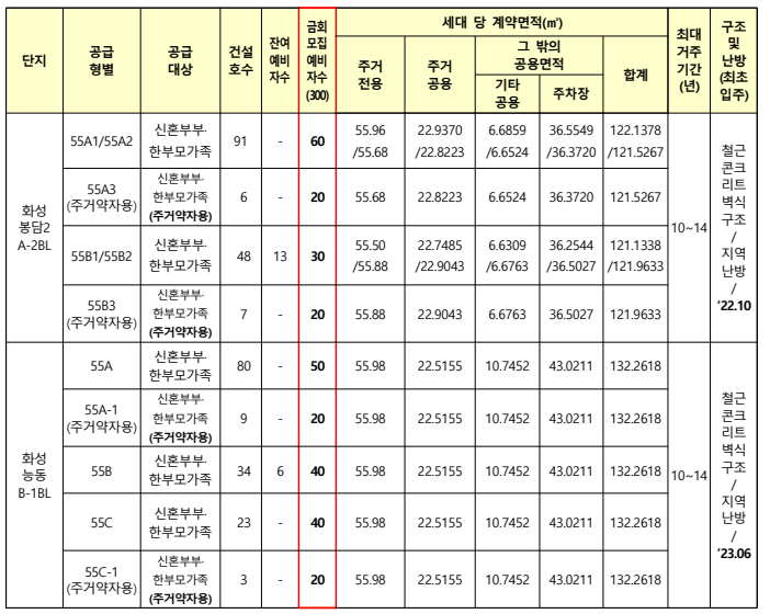 화성봉담2 A-2BL에서는 총 152호(주거약자용 포함), 화성능동 B-1BL에서는 총 149호가 예비입주자 대상입니다. 공급은 55㎡대 평형 위주로, 주거약자용 주택에는 고령자(65세 이상), 장애인, 국가유공자 등 사회적 배려대상자가 우선권을 가집니다. 예비입주자로 선정되면 차후 공가(빈집)나 해약 발생 시 대기순번에 따라 입주 확정이 진행됩니다.