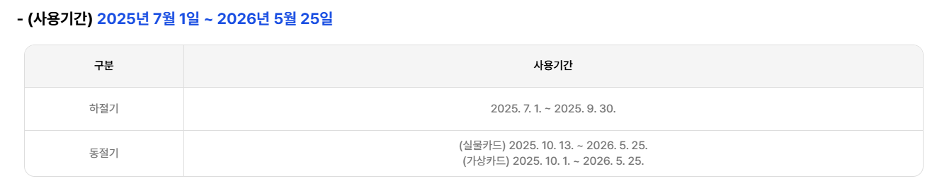 세대 평균 지원 단가는 약 36만 7,000원입니다. 올해부터는 하절기와 동절기 구분 없이 2025년 7월 1일부터 2026년 5월 25일까지 자유롭게 사용할 수 있습니다. 단, 하절기에 사용하지 않고 동절기에 몰아서 사용하고 싶다면 별도의 미차감 신청이 필요합니다.
