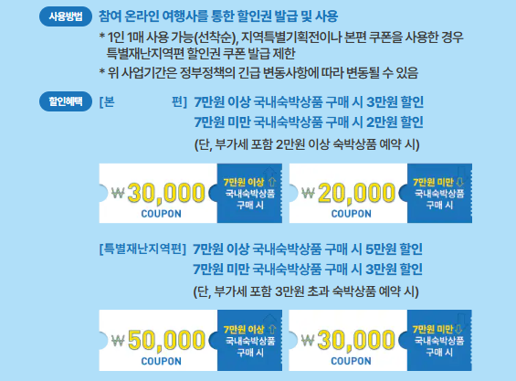 - 본편: 전국 비수도권(서울·경기·인천 제외) 숙소에서 7만원 이상 예약 시 3만원, 7만원 미만(2만원 이상) 예약 시 2만원 할인 쿠폰 제공