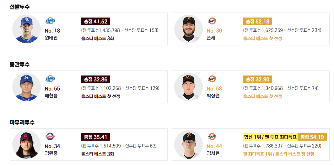 - 선발투수: 원태인 (삼성, 총점 41.52점, 올스타 베스트 3회) - 삼성의 원태인 선수가 3번째 올스타 베스트 선발 투수에 선정되었습니다. 그의 정교한 제구가 올스타전에서도 빛날 것입니다.