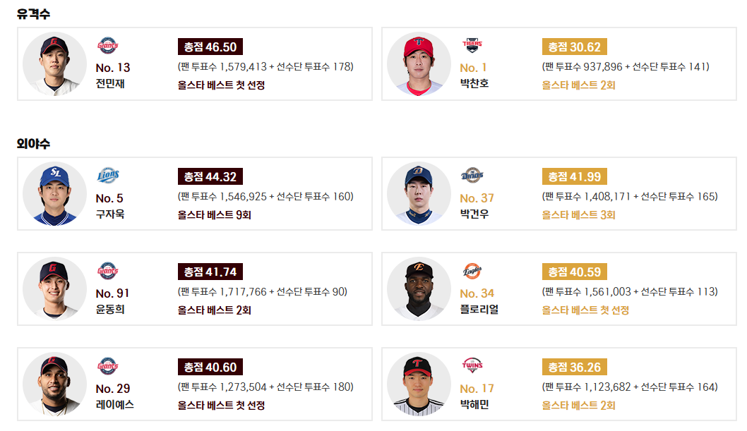 - 지명타자: 최형우 (KIA, 총점 32.98점, 올스타 베스트 8회) - KIA의 최형우 선수가 지명타자 부문에서 8번째 올스타 베스트에 선정되었습니다. 그의 관록 있는 타격이 나눔 올스타에 무게감을 더할 것입니다.