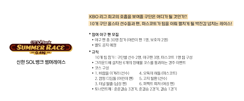 이 외에도 신한 SOL뱅크와 함께하는 썸머레이스, 플레이볼 세리머니, 애국가 제창 및 시구, 그리고 신한 SOL뱅크 위터 페스티벌, CGV 클리닝 타임 쇼 등 흥미진진한 이벤트들이 마련되어 있습니다.