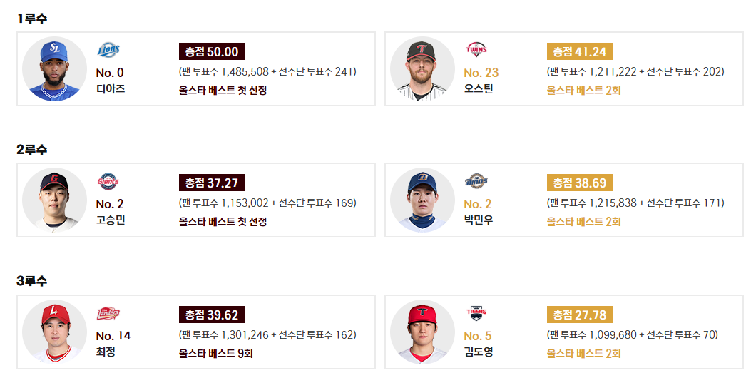 - 1루수: 디아즈 (삼성, 총점 50.00점, 올스타 베스트 첫 선정) - 삼성의 디아즈 선수가 인상적인 활약으로 생애 첫 올스타에 선정되었습니다. 강력한 타격이 올스타전에서도 이어질지 기대됩니다.