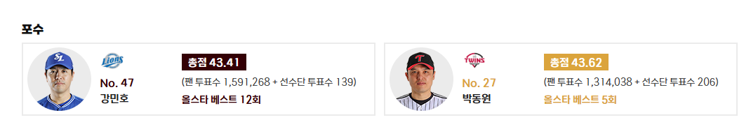 - 포수: 강민호 (삼성, 총점 43.41점, 올스타 베스트 12회) - 베테랑 포수 강민호 선수가 무려 12번째 올스타 베스트 선정이라는 대기록을 달성했습니다. 그의 경험과 리더십이 드림 올스타를 이끌 것입니다.