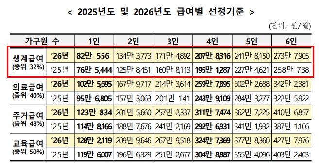 생계급여는 기준 중위소득 대비 32% 이하의 소득인정액을 가진 가구를 대상으로 지원됩니다. 2026년부터 기준은 다음과 같이 상향됩니다: