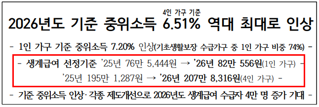 - 2026년 4인가구 기준 중위소득: 649만4,738원(6.51%↑)