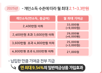 - 정부기여금: 소득 수준에 따라 월 납입액의 3~6% 추가 지원