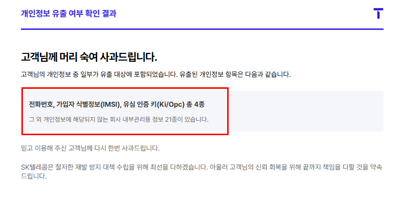 역시나 예상했던대로 4가지 개이정보인 전화번호, 가입자 식별정보, 유심 인증 키 등 총 4종과 개인 정보에 해당하지 않은 회사 내부 관리용정보 21종이 유출되었다고 아래와 같이 나옵니다.