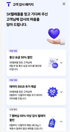 이번 SKT 개인정보 유출과 관련해서 SK텔레콤에서는 8월 한달 전화요금 50% 할인과 데이터 50기가 추가 제공(8월~12월)의 혜택을 제공한다고 합니다. 하지만 집털리고 주는 이러한 소소한 혜택은 어이없기만 하네요.