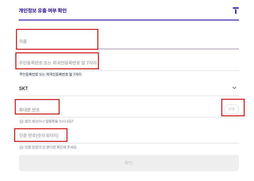 - 개인정보 유출 여부 확인 페이지에서 이름, 주민등록번호, 통신사, 휴대폰번호, 인증번호를 입력해 본인 인증을 진행합니다.