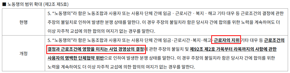 - 노동쟁의 범위 확대로 노동자 권익 강화