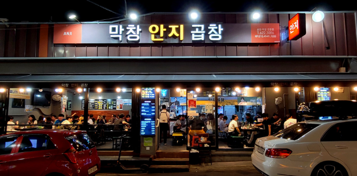 안지곱창막창은 이 골목에서 가장 인기 있는 집 중 하나로, 양념곱창과 막창 세트를 29,000원에 제공합니다. 이곳은 새벽 4시까지 영업하여 야식으로도 인기가 높으며, 특히 치즈막창은 젊은 층에게 큰 인기를 끌고 있습니다. 가족 단위 방문객들을 위해 테이블석도 충분히 마련되어 있어 편안한 식사가 가능합니다.