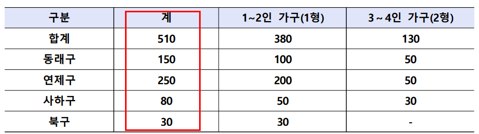 - 동래구, 연제구, 사하구, 북구 총 510세대 공급