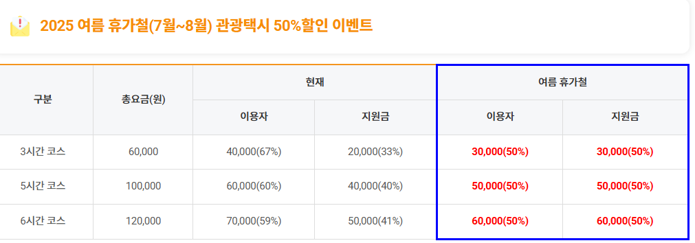 - 5시간 코스: 총요금 100,000원 → 50,000원 (이용자 부담금)