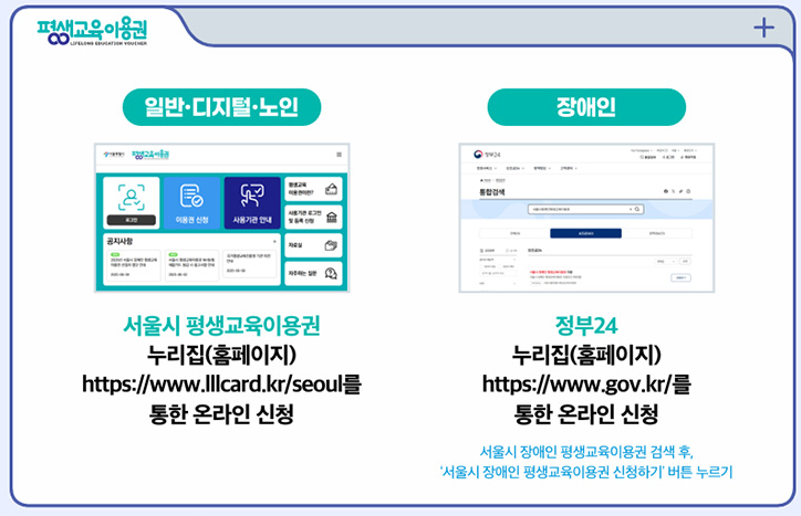 - 문의처: 서울시 평생교육이용권 상담콜센터(1551-4777), 장애인 평생교육이용권 상담센터(1668-0420)