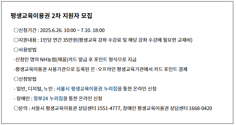 - 신청 기간 및 방법: 2025년 6월 26일 10시 ~ 7월 10일 18시 / 일반·디지털·노인: 서울시 평생교육이용권 누리집, 장애인: 정부24 누리집