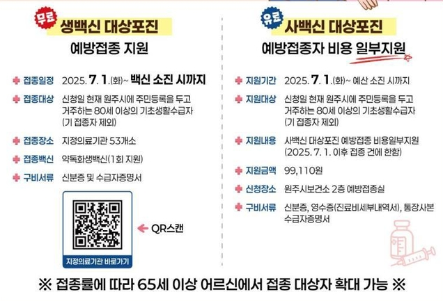 이번 원주시의 지원사업은 접종비 부담을 없애고, 취약계층 어르신의 건강한 노후와 삶의 질 향상에 직접적으로 기여할 것으로 기대됩니다.
