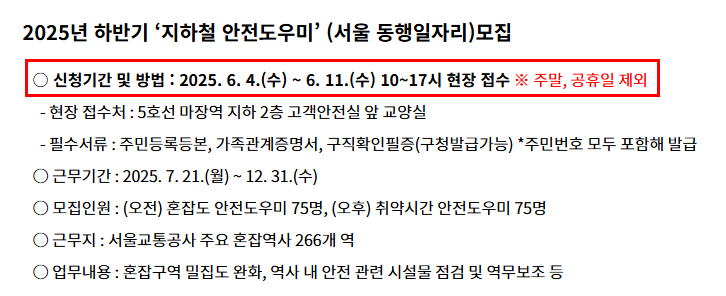 2025년 하반기 지하철 안전도우미 신청은 2025년 6월 4일(수)부터 6월 11일(수)까지 평일 오전 10시~오후 5시, 현장 접수로만 진행됩니다.