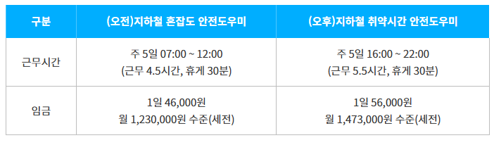 - 임금: 혼잡도 안전도우미(1일 46,000원, 4.5시간 근무)/ 취약시간 안전도우미(1일 56,000원, 1일 5.5시간 근무)
