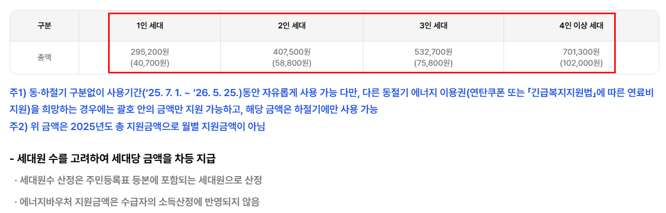 2025년 에너지 바우처는 가구원 수에 따라 연간 최소 29만 5,200원(1인 세대)에서 최대 70만 1,300원(4인 이상 세대)까지 차등 지급됩니다.