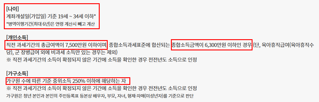 - 연령 요건: 만 19세 이상 34세 이하(병역이행 기간은 최대 6년까지 인정)