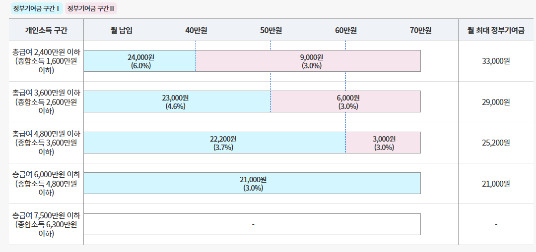 - 정부기여금 지급 조건: 소득이 일정 수준(총급여 6,000만 원 이하, 가구 중위소득 250% 이하)인 경우에만 정부기여금이 지급됩니다.
